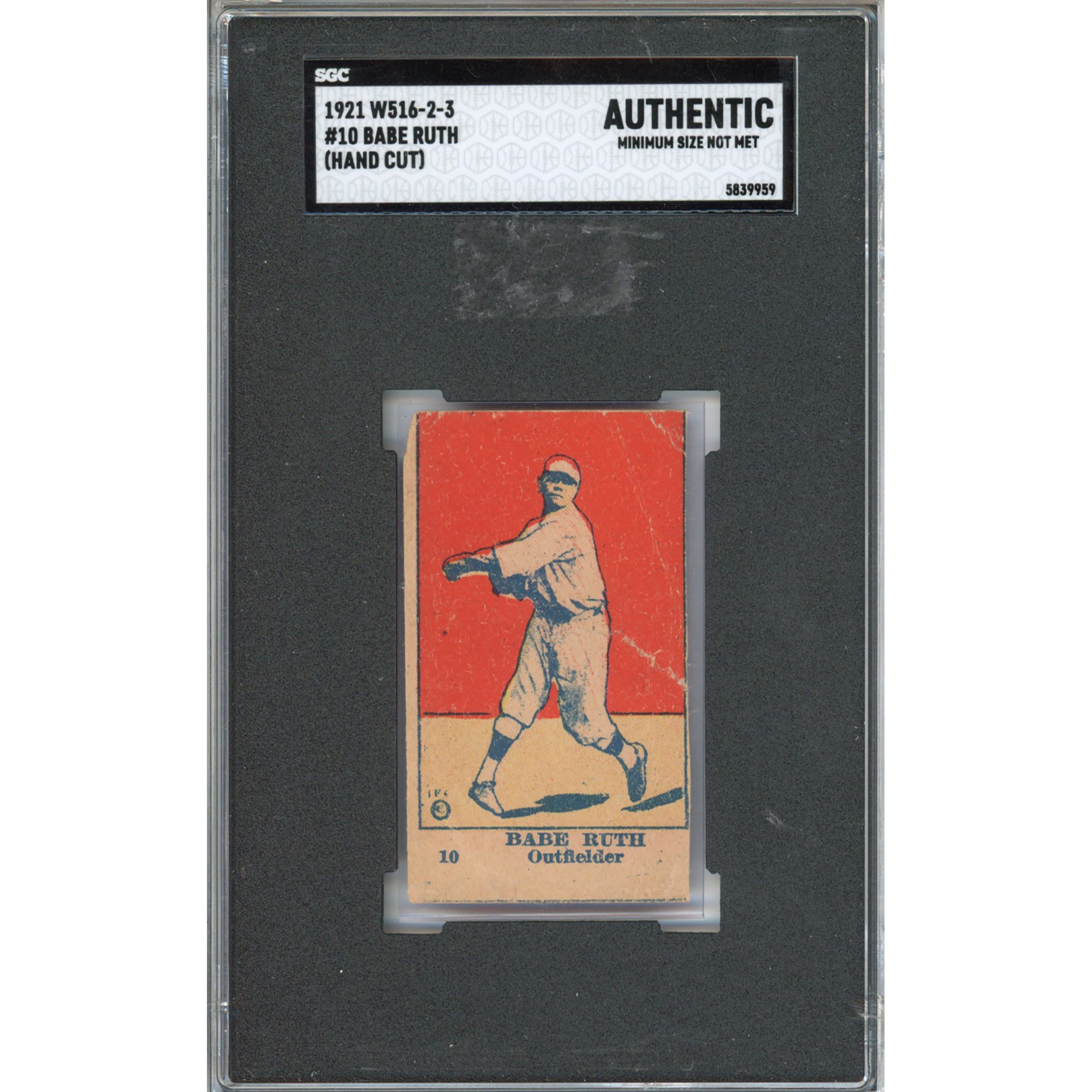 The 1921 W516-2-3 #10 Babe Ruth is a rare, hand-cut, black-and-white strip card showing Ruth as a pitcher (though he was famous for hitting) from a set by International Feature Service that featured colorized art but often had printing/cutting errors, making high-grade examples extremely scarce and valuable. Offered here is a more attainable SGC slabbed authentic (Min Size Not Met) example of the card.