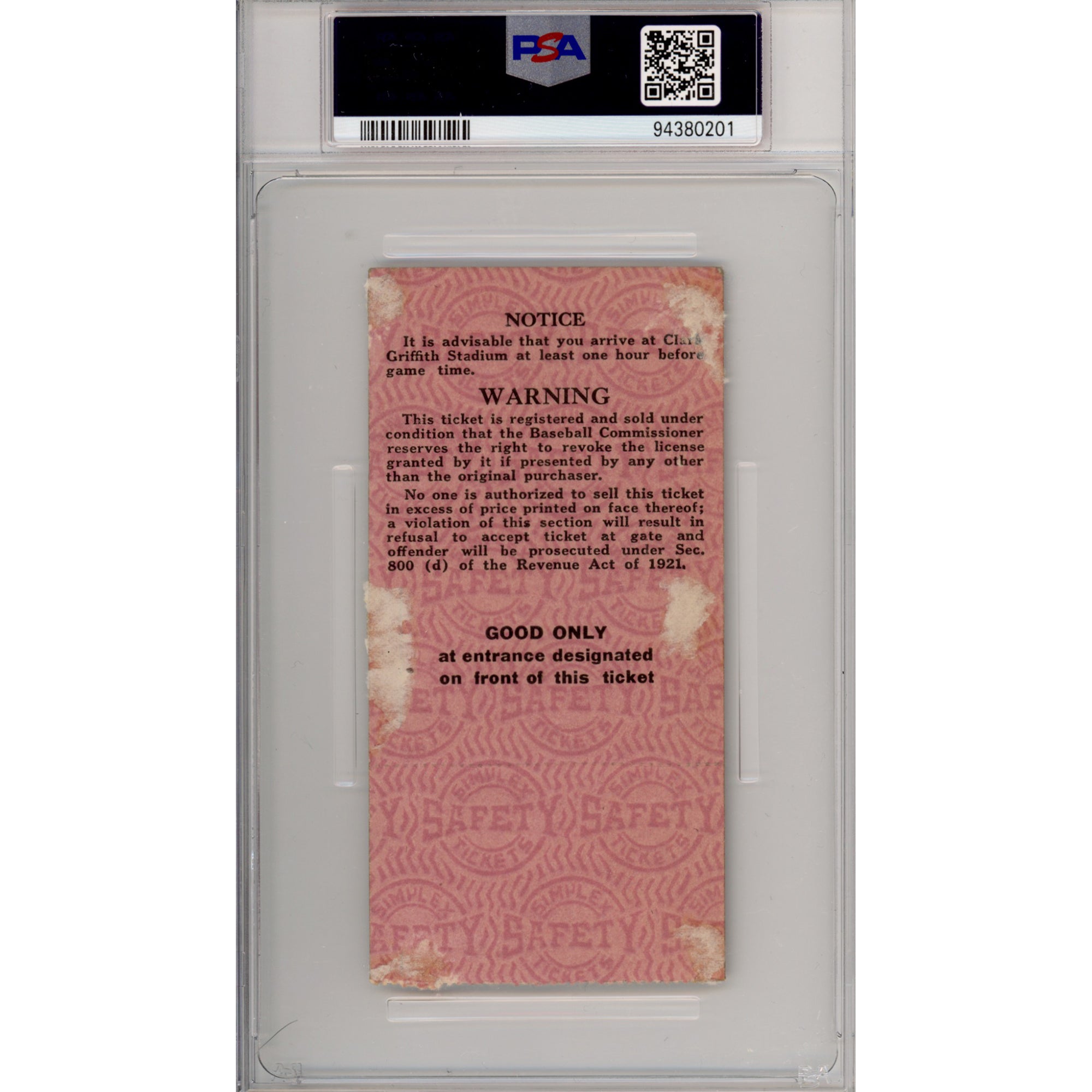 The Washington Senators defeated the New York Giants 4-3 in 12 innings in Game 7 of the 1924 World Series on October 10, 1924, at Griffith Stadium in Washington, D.C. The thrilling extra-inning victory secured the Senators' first and only World Series championship during their time in Washington. Senators ace pitcher Walter "The Big Train" Johnson, who had lost his two previous starts in the series, came on in relief in the top of the ninth inning. He pitched four scoreless innings, navigating several jams and keeping the Giants from scoring, to push the game into extra innings. This beautiful 1924 game 7 ticket stub is graded and encapsulated as a GOOD 2 by PSA/DNA.