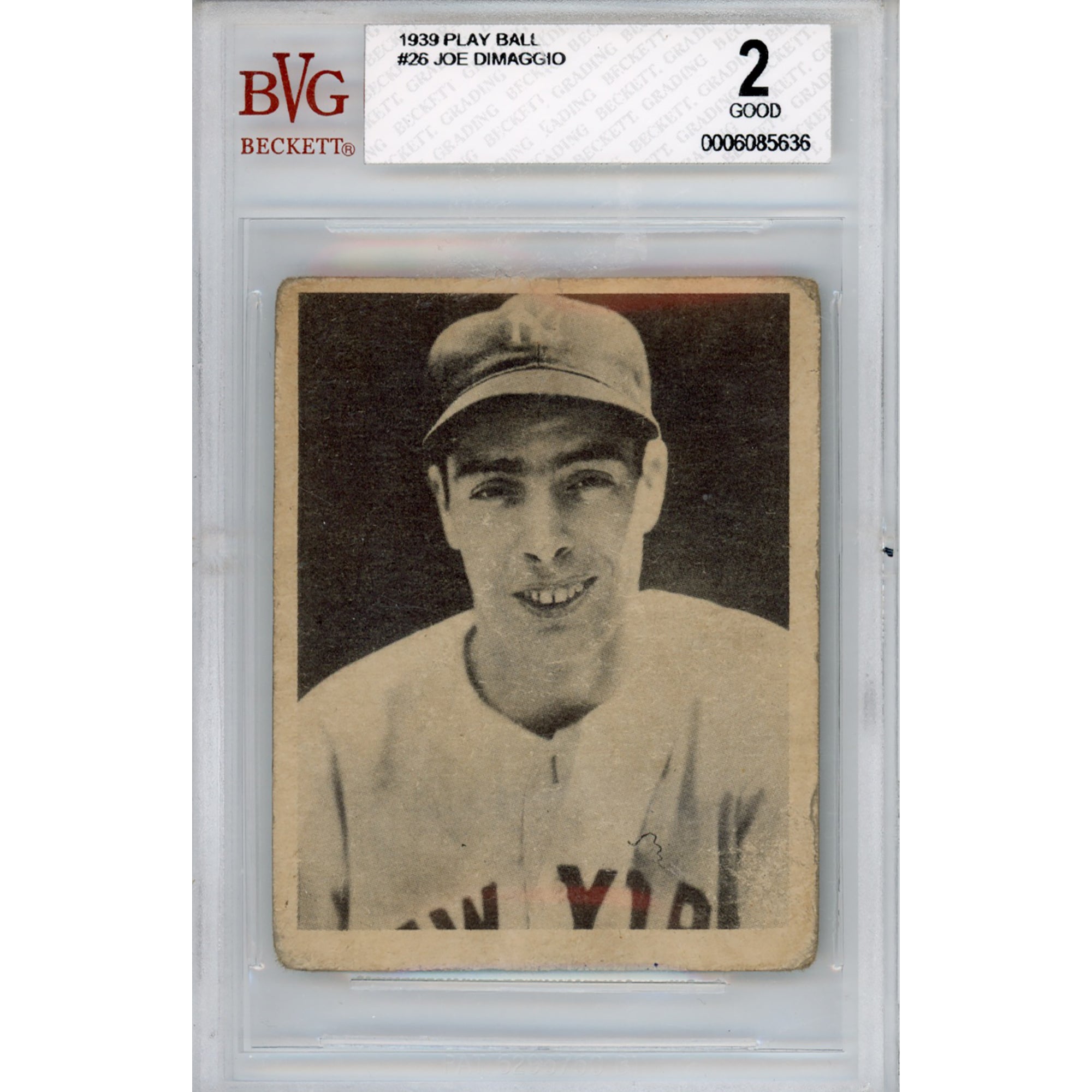 The 1939 Play Ball #26 Joe DiMaggio card is one of the most important and sought-after vintage baseball cards of the pre-war era, marking the first major card release of one of the game's most iconic players. Issued by Gum, Inc., the 1939 Play Ball set was the company's debut baseball release and is highly regarded for its clean, black-and-white photographic design and strong roster of legendary players. Featuring softer corners, this lower graded copy features good centering and the image of DiMaggio has great eye appeal. This 1939 Play Ball #26 Joe DiMaggio has been graded and encapsulated as Good 2 by Beckett (BVG).