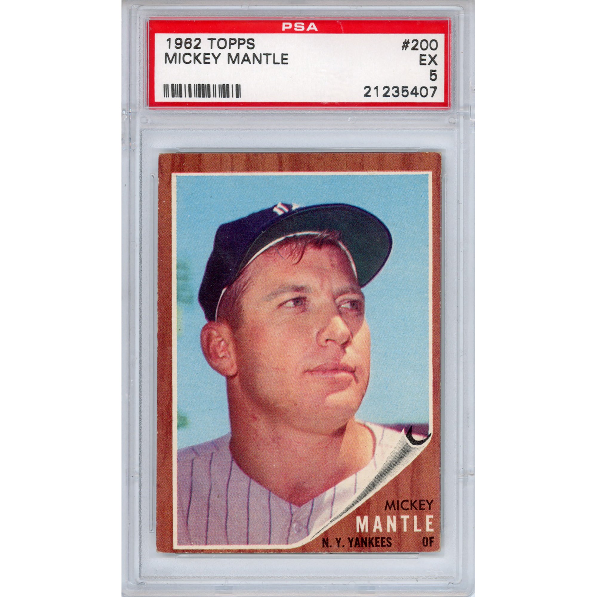 Hall of Famer Mickey Mantle, the power-hitting slugger and three-time American League MVP, was a dominant force for the New York Yankees during one of the most successful eras in baseball history. Card #200 from the 1962 Topps set features the distinctive wood-grain border design and captures Mantle at the start of his third MVP season, when he remained one of the most feared hitters in the game. That year, despite injuries, he still posted a .321 batting average and helped lead the Yankees to another World Series title. The card shows him with some sweat on his brow. As one of the most recognizable and challenging cards in a set that's notorious for print flaws and wear along the faux wood-grained borders, this Mantle issue is offered here in a nice mid grade example,, which has been graded and encapsulated an EX 5 by PSA/DNA.