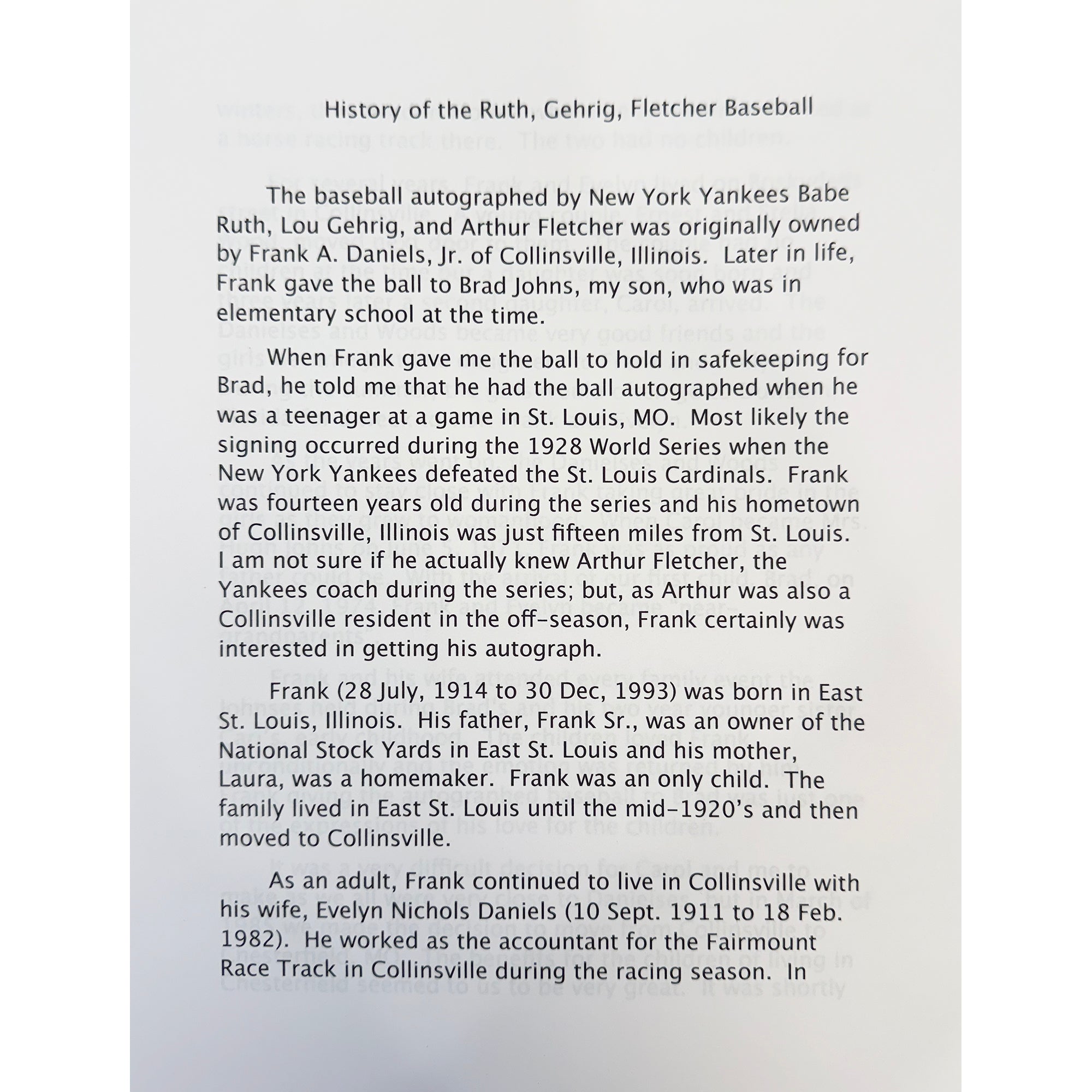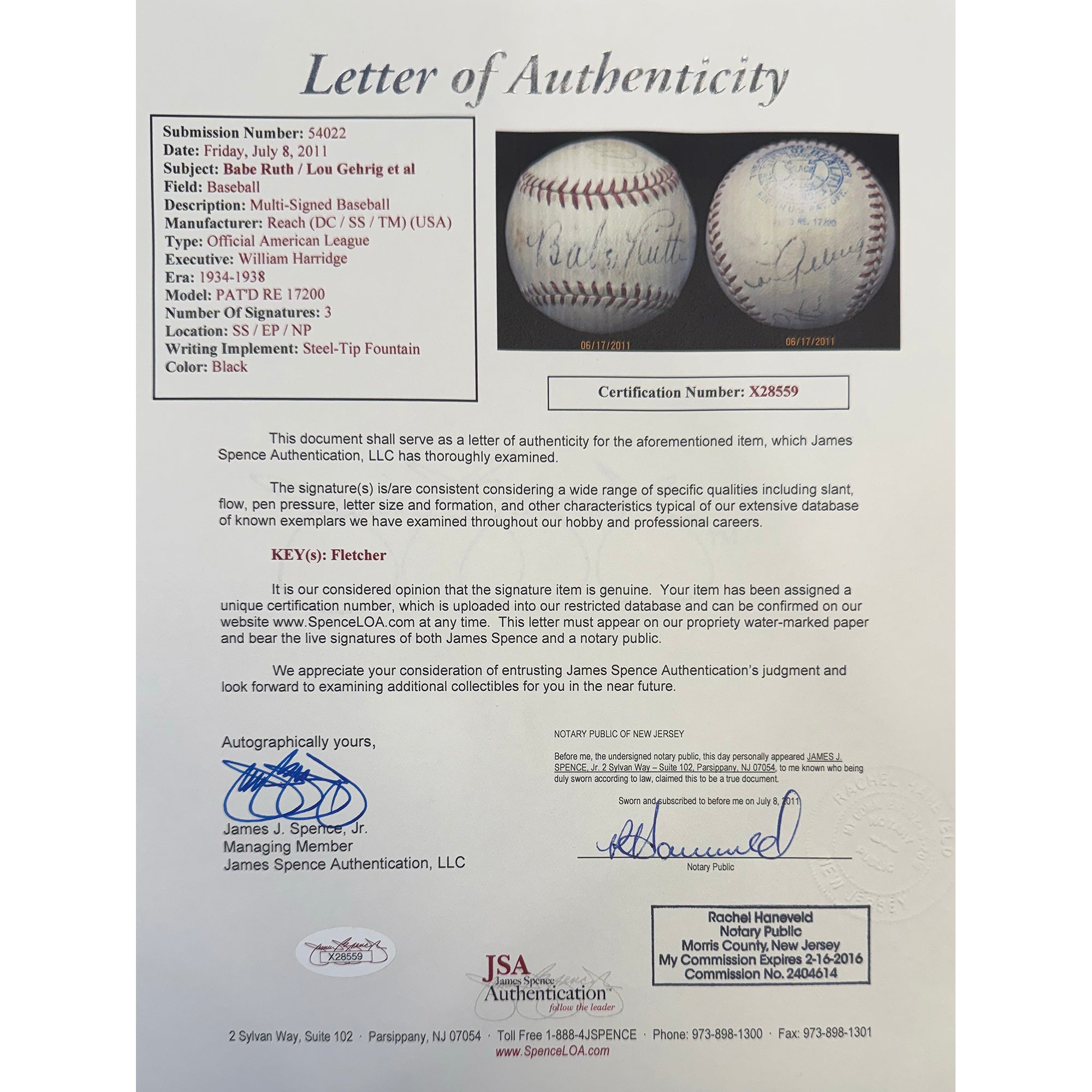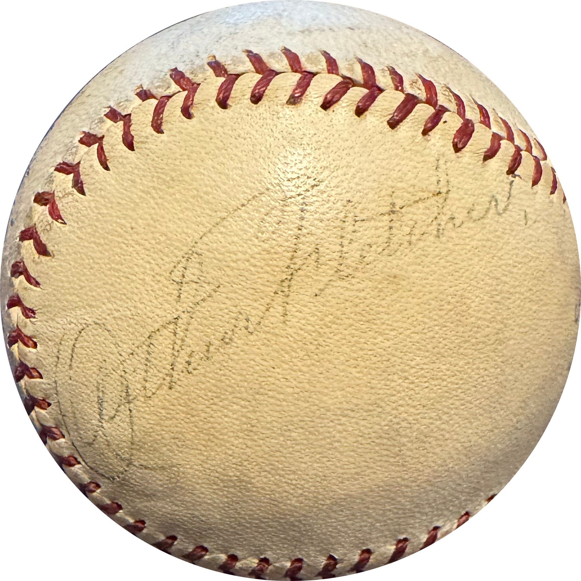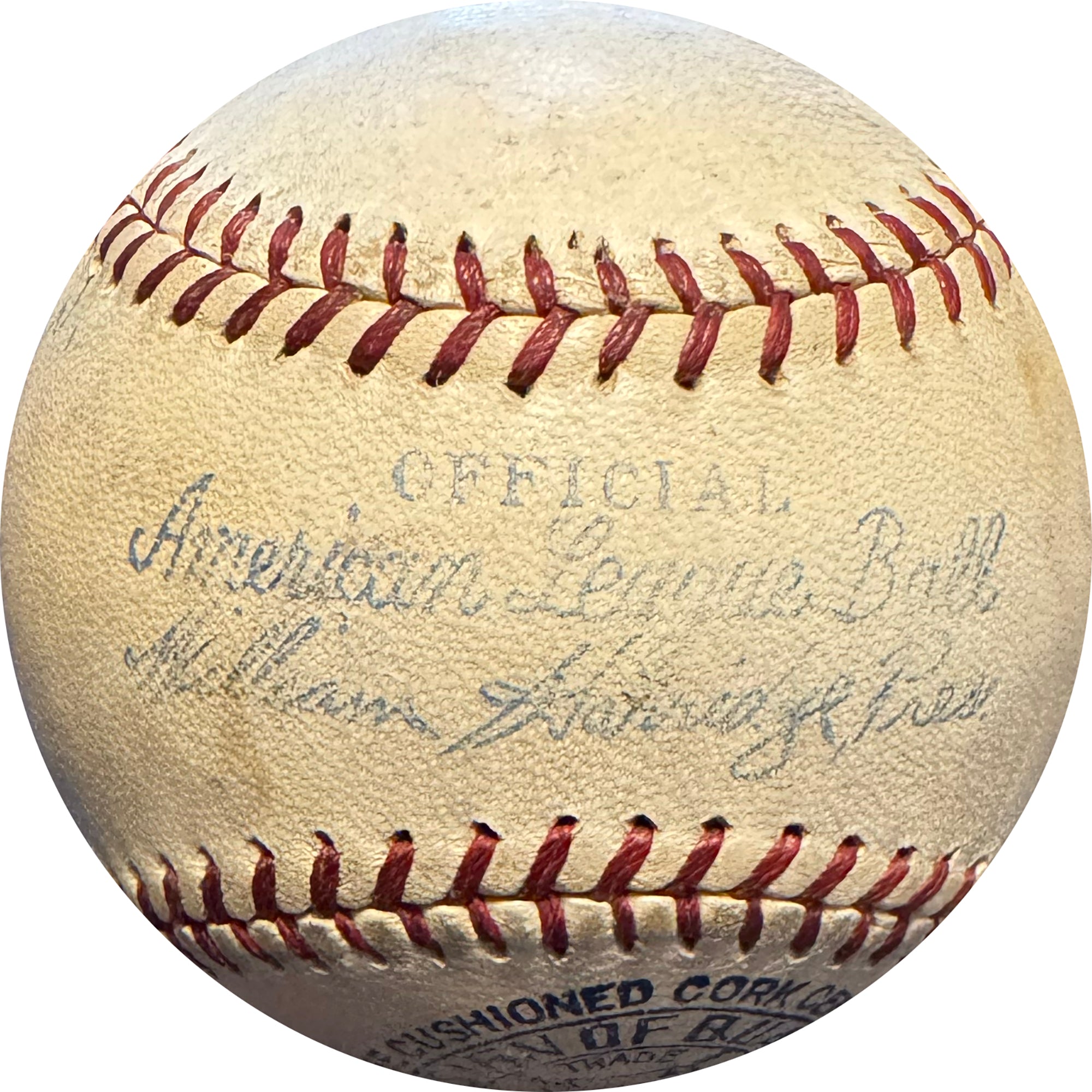 Lou Gehrig, nicknamed "the Iron Horse" for his durability, was the legendary first baseman who played his entire 17-season career with the New York Yankees from 1923 to 1939. He is best known for his record of 2,130 consecutive games played, and being the other half of the Yankees Murderers Row duo. A career .340 hitter, Gehrig hit 493 HRs and 1,995 RBI. Gehrig won six World Series rings as a Yankee, Gehrig's consecutive games streak ended on May 2, 1939, when he removed himself from the lineup due to his declining health. Shortly after, he was diagnosed with ALS. The Yankees retired his number 4 uniform the same year, the first time in MLB history a player received this honor. He delivered his famous "luckiest man on the face of the earth" speech on July 4, 1939. Due to his immense impact on the game, Gehrig was enshrined via special election to the Baseball Hall Of Fame in 1939, the same year as his final game. It remains the only such time in history that this has happened. Gehrig would pass away from the disease on June 2, 1941, at age 37 from amyotrophic lateral sclerosis (ALS), now commonly known as "Lou Gehrig's Disease". This William Harridge AL Baseball has been hand signed by both Babe Ruth and Lou Gehrig, in addition to Arthur Fletcher, and comes fully authenticated with a complete Letter of Authenticity from JSA. While the autographs themselves are moderately bold and clearly legibile on this 1930s time period baseball, this ball is the perfect mid level orb for a collector looking for an affordable Ruth Gehrig with excellent eye appeal.