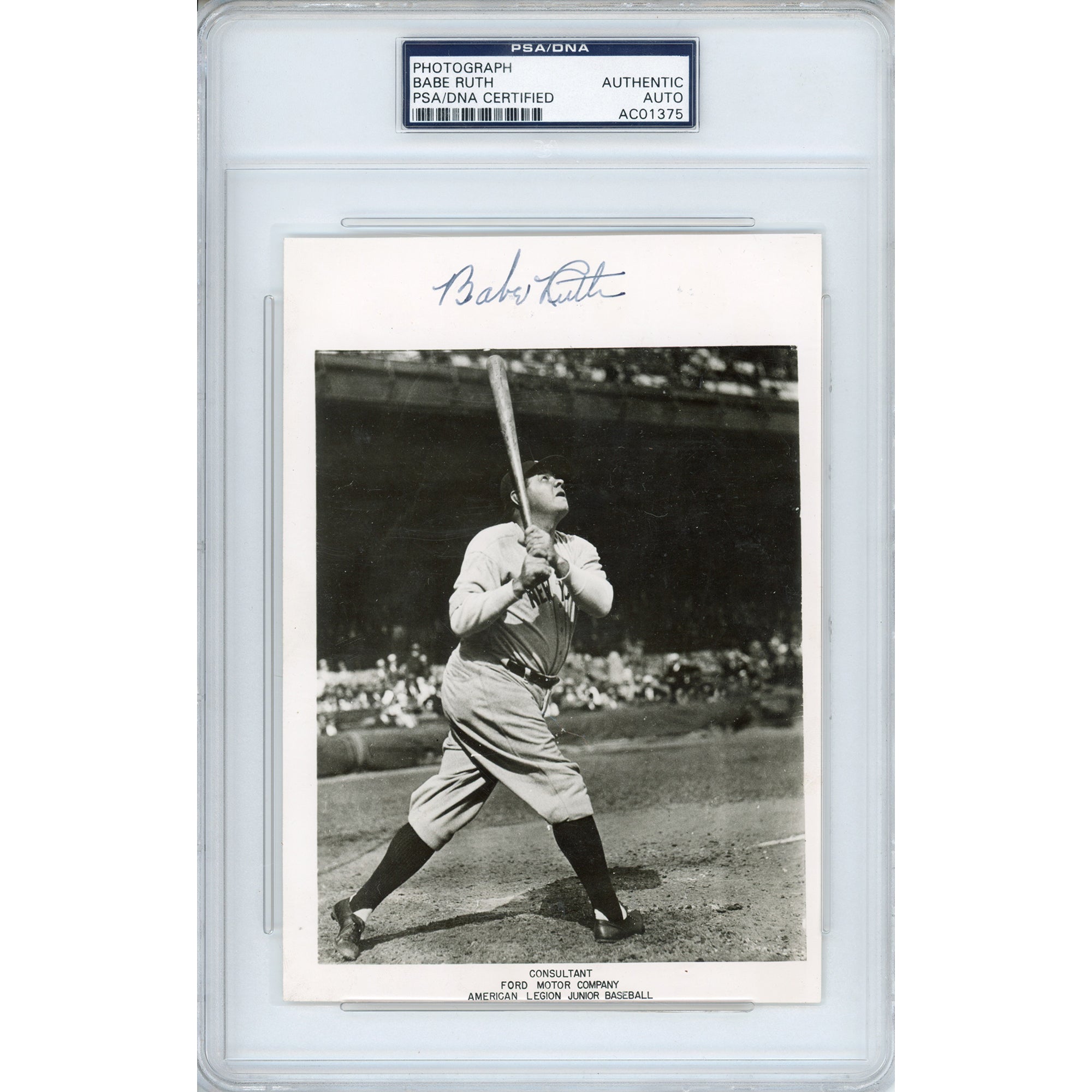 Babe Ruth, nicknamed "The Sultan of Swat" and "The Bambino," was an American professional baseball player widely considered the greatest to ever play the game and one of America's most iconic sports heroes. He revolutionized baseball, ushering in the "live-ball era" with his prodigious home-run hitting power. RuthÕs 1927 season, which featured 60 HRs amongst its accomplishments, is one of the greatest seasons in Baseball history. Ruth famously converted from pitcher to hitter early on in his career, which is attributed by him being the all time WAR leader with 182.6. Additionally, he held a record for 29 2/3 consecutive scoreless innings pitched in the World Series, a mark that lasted until 1961. Ruth hit 714 career homeruns (which still ranks 3rd all time), and is widely considered the greatest player in the history of the game. This Babe Ruth Ford Motor Company Promotional Photo has been hand signed in bold blue fountain pen. It comes fully authenticated and encapsulated by PSA/DNA.