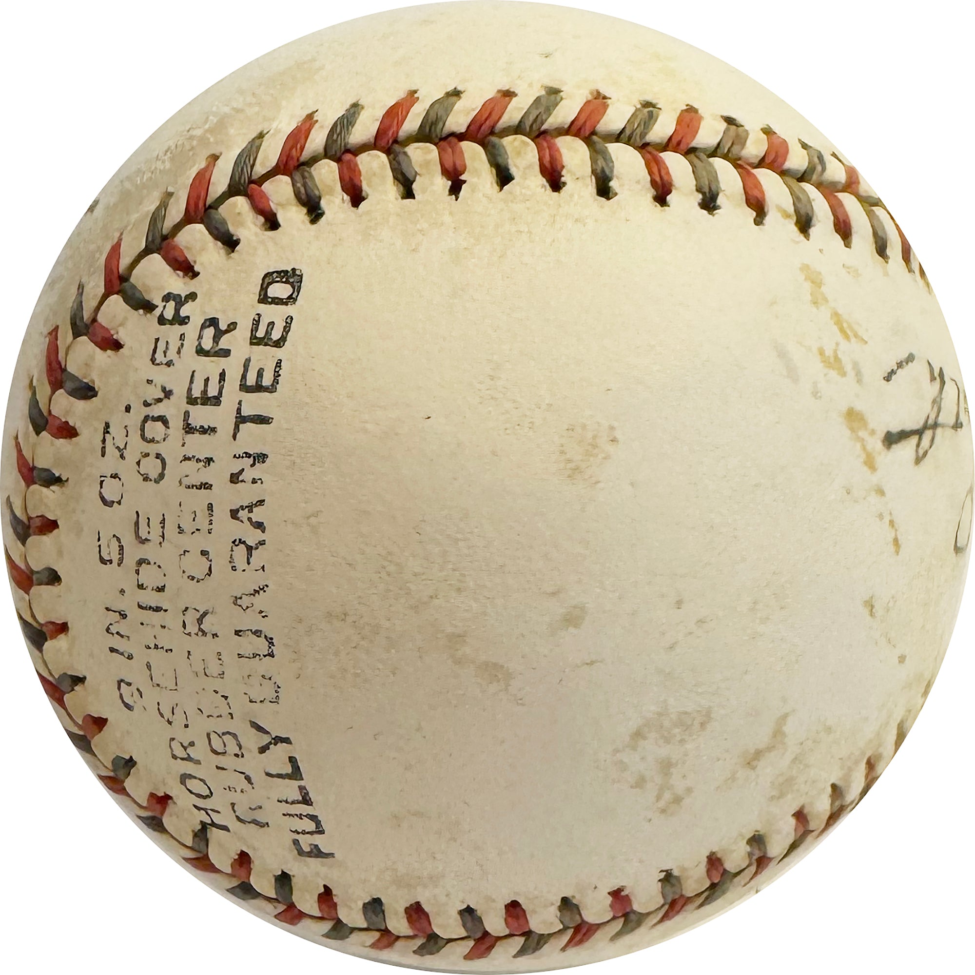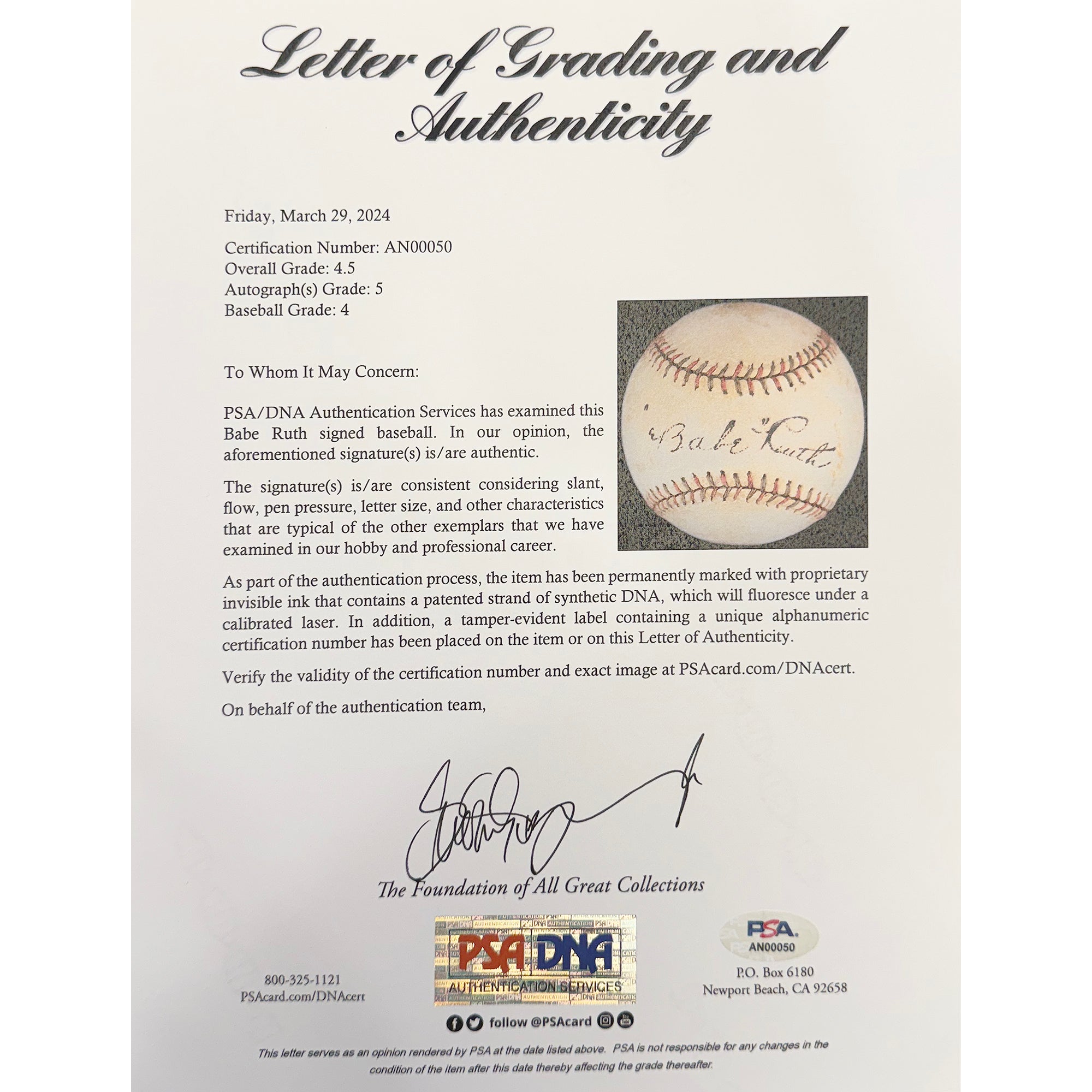 Babe Ruth, nicknamed "The Sultan of Swat" and "The Bambino," is widely considered the greatest to ever play the game and one of America's most iconic sports heroes. He revolutionized baseball, ushering in the "live-ball era" with his prodigious home-run hitting power. RuthÕs 1927 season, which featured 60 HRs amongst its accomplishments, is one of the greatest seasons in Baseball history. Ruth famously converted from pitcher to hitter early on in his career, which is attributed by him being the all time WAR leader with 182.6. Additionally, he held a record for 29 2/3 consecutive scoreless innings pitched in the World Series, a mark that lasted until 1961. Ruth hit 714 career homeruns (which still ranks 3rd all time), and is widely considered the greatest player in the history of the game. This Babe Ruth "Star" Baseball has been hand signed in black fountain pen and features a light but legibile sweet spot autograph with quotations, a signature of early career and playing day autographs from the Bambino. The perfect entry level Babe Ruth single signed baseball to start your collection. It comes with a full letters of authenticity from PSA/DNA Authentication, which has graded a PSA 5 Auto, PSA 4 Baseball and given an overall 4.5. This perfect mid grade single signed Baseball features everything for the discerncing collector looking for their centerpiece. Strong Autograph, 1920s playing days Ruth auto with Quotes and perfectly placed on the sweetspot.