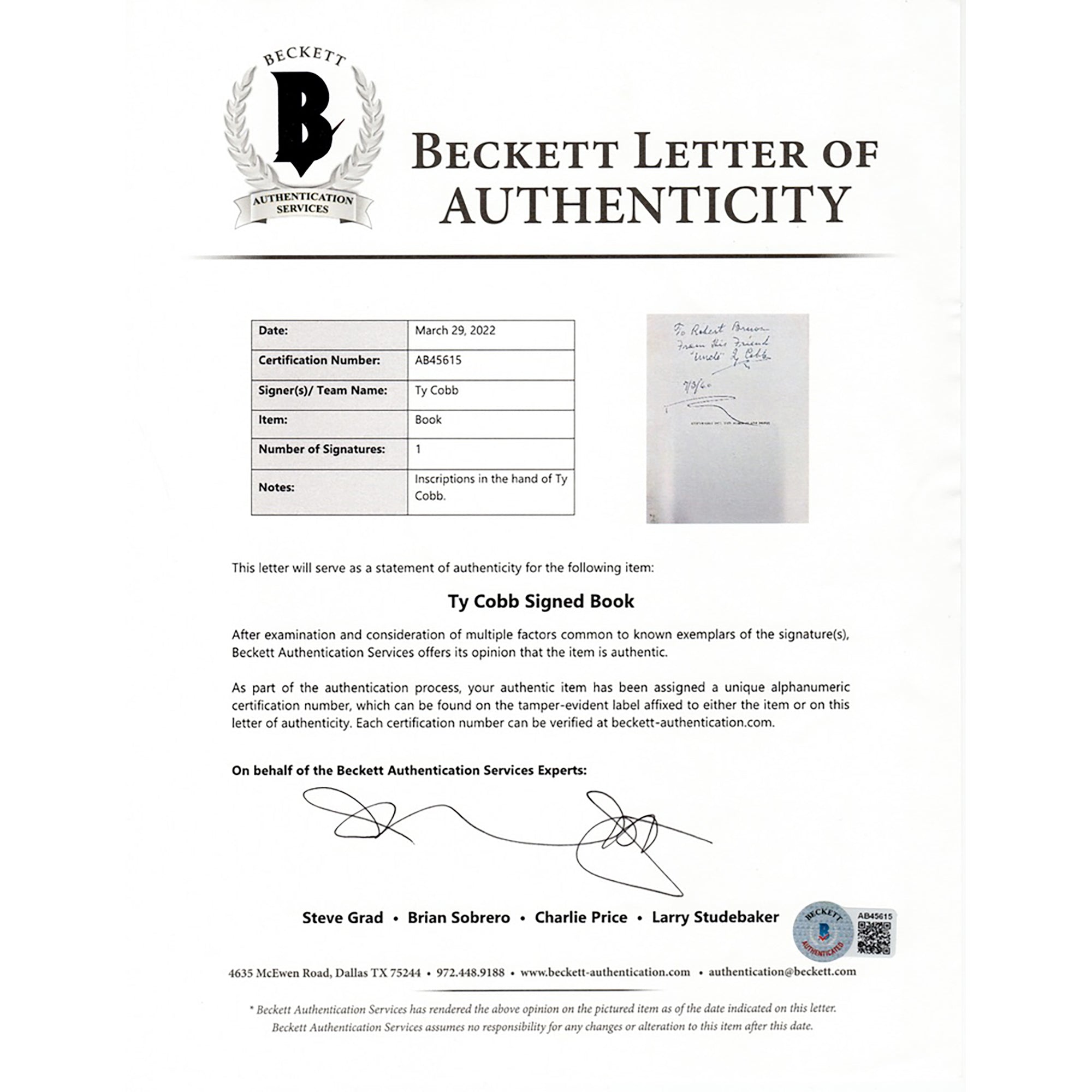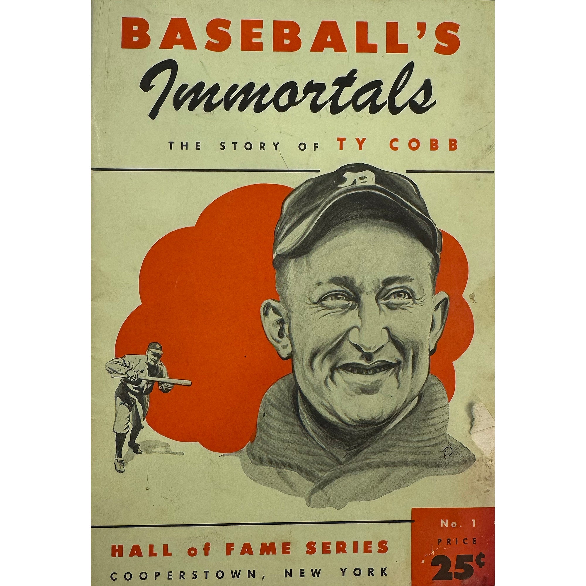 Ty Cobb is widely regarded as one of the greatest baseball players of all time, known for his aggressive base running and ability to hit to all fields. He was a member of the inaugural class inducted into the National Baseball Hall of Fame in 1936, receiving the most votes of any player on the ballot. He also served as the Tigers' player-manager for six seasons (1921Ð1926). Ty Cobb owns the greatest batting average in MLB History (.366), and ranks second all item in hits at 4,189. Cobb won the 1909 batting Triple Crown and ranks in the top 10 all time in Runs, Stolen Bases and RBIs. Ty Cobb has and signed this Baseball Immortals Booklet on the inside cover in bold blue ink, and inscribed "To Robert Brenon From his friend "Uncle" Ty Cobb - 7/30/60". This item comes complete with full letters of authenticity from JSA, PSA/DNA and Beckett.